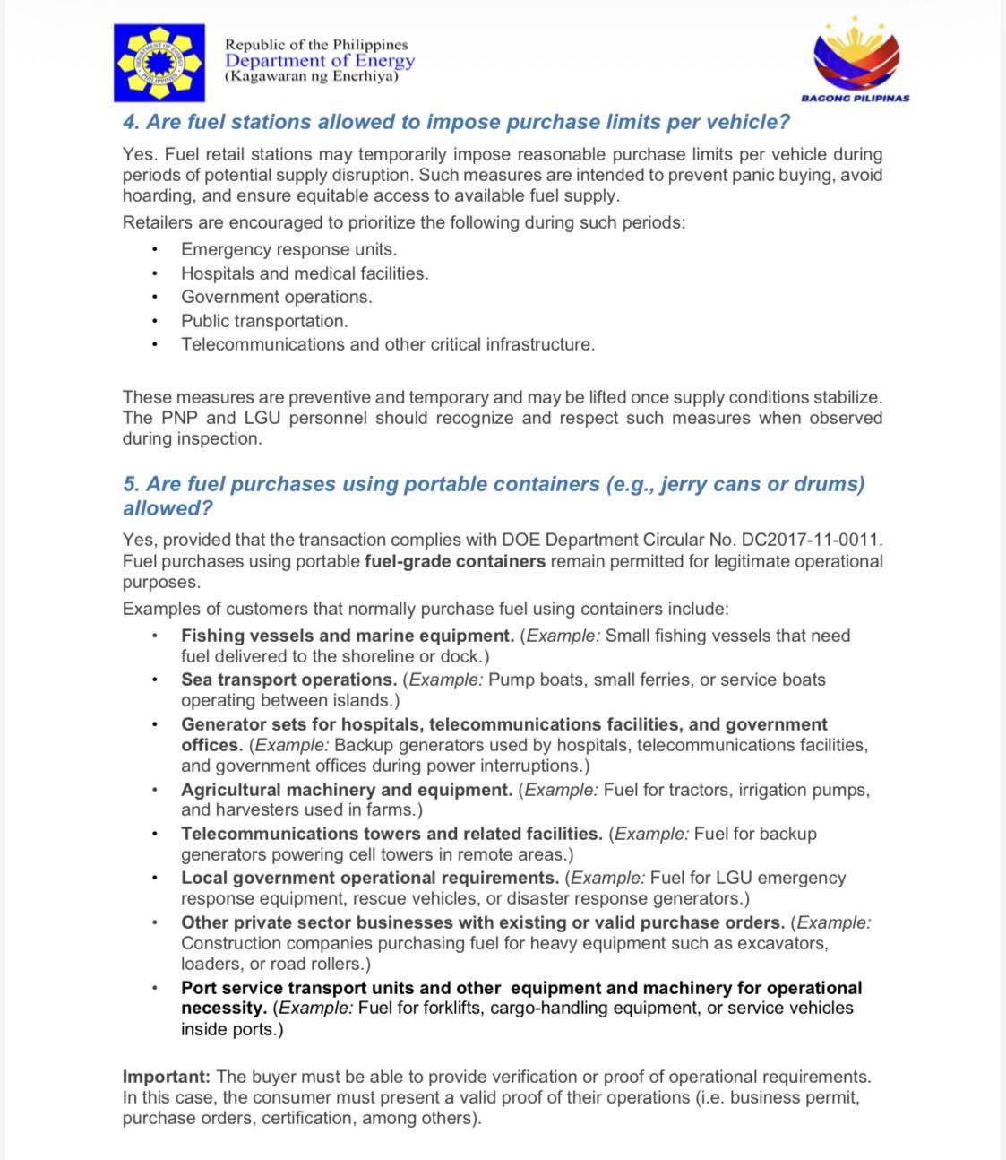 The agency clarified that the purchase of fuel products using drums and containers is allowed for the legitimate operations of fishing vessels, sea transport, generator sets, and agricultural machinery.